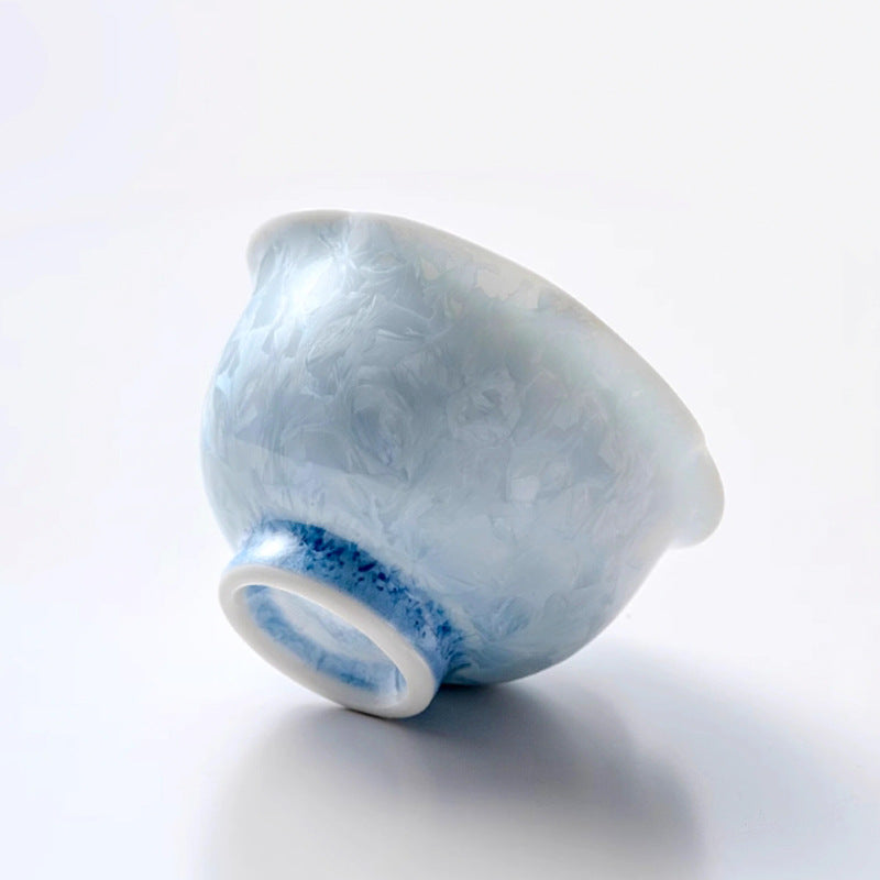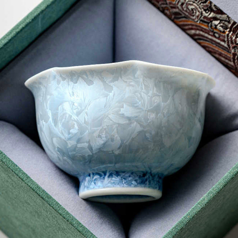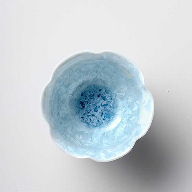 Experience the magic of kiln-fired artistry with this flower-rimmed crystalline glaze teacup, available in soothing blue or...